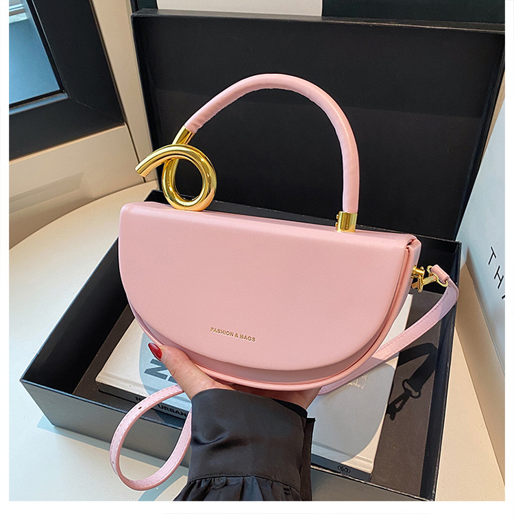 Aurora Half-Moon Handbag with a golden spiral handle and detachable strap. This stylish ladies bag in Bangladesh is compact, durable, and perfect for daily use or evening outings.